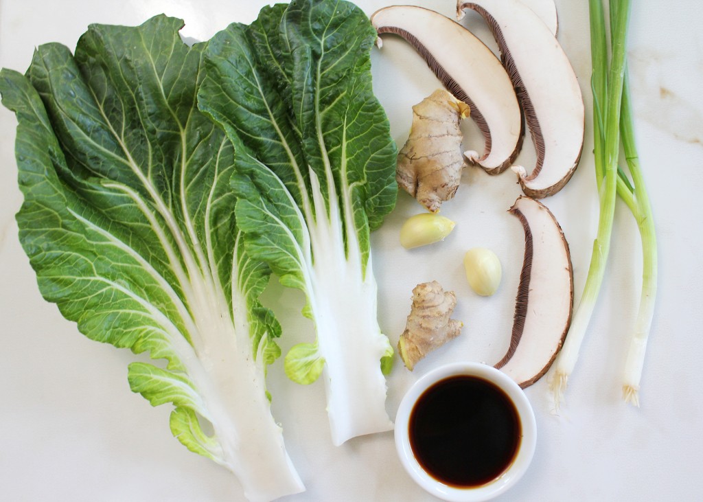 - Divide rice into two bowls and top with bok choy, mushrooms, chicken and eggs.